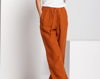 Burnt orange linen pants Clearance, Relaxed fit orange linen summer pants Clearance