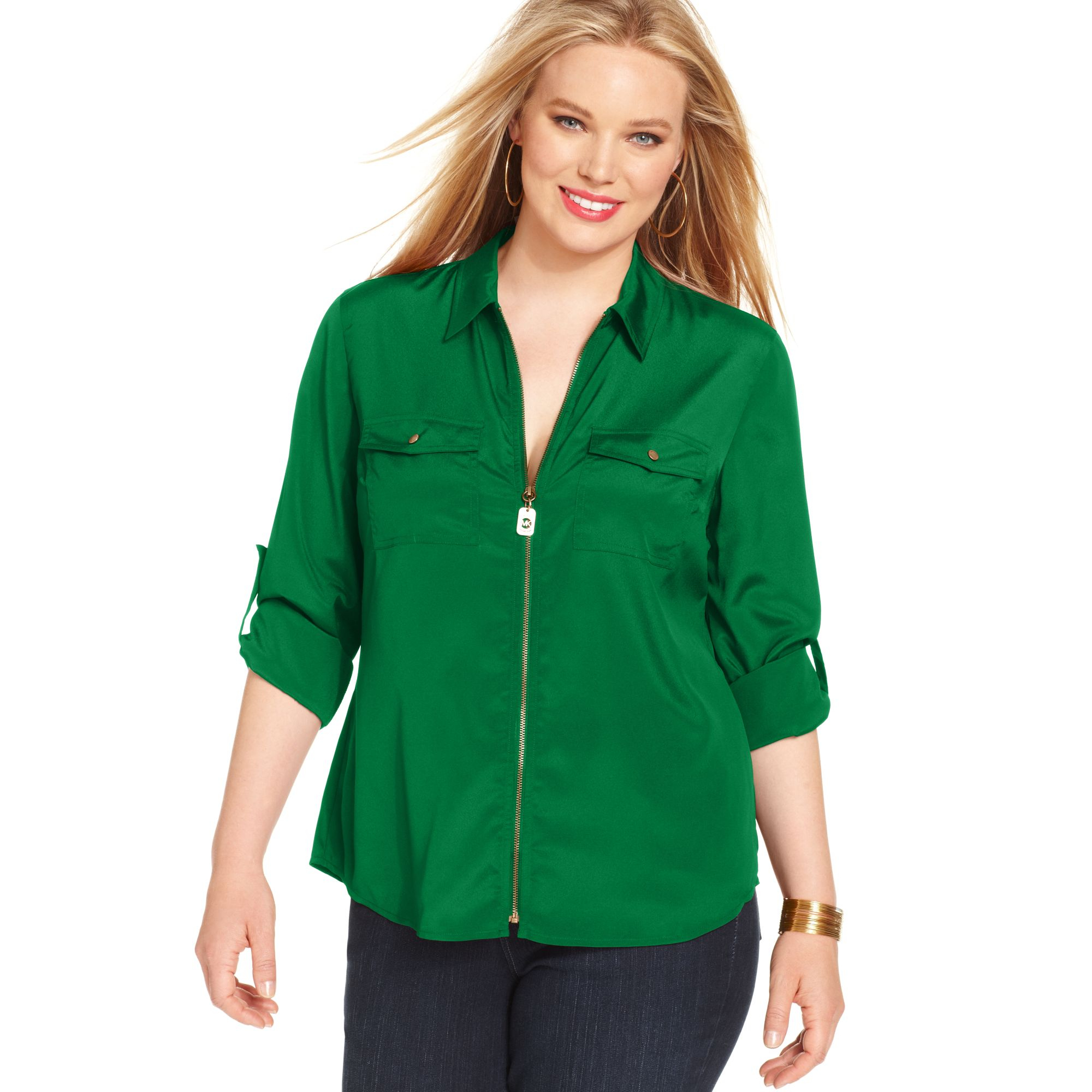 Michael kors green shirt Clearance, Long Sleeve Zip Front Shirt in Green Clearance