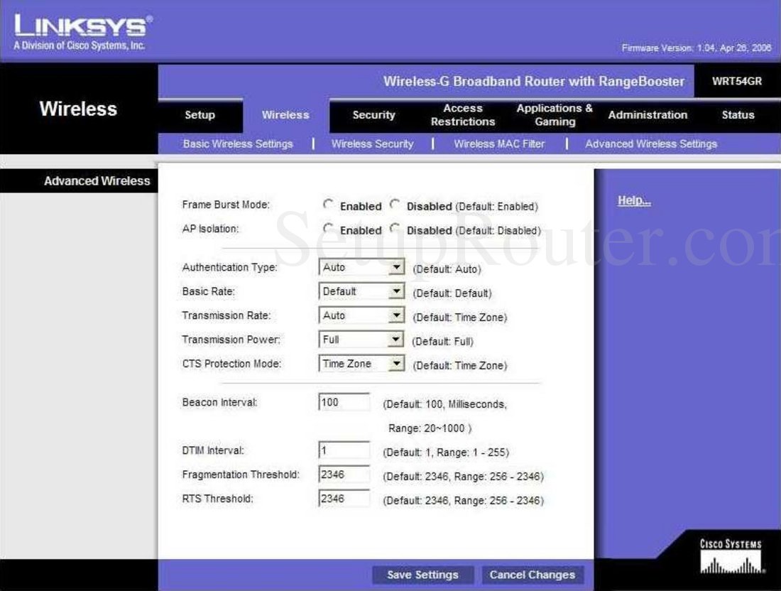 Linksys wrt54gr Clearance, Linksys WRT54GR Screenshot Advanced Wireless Settings Clearance