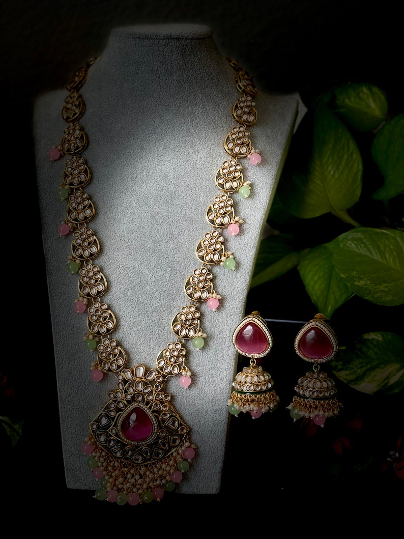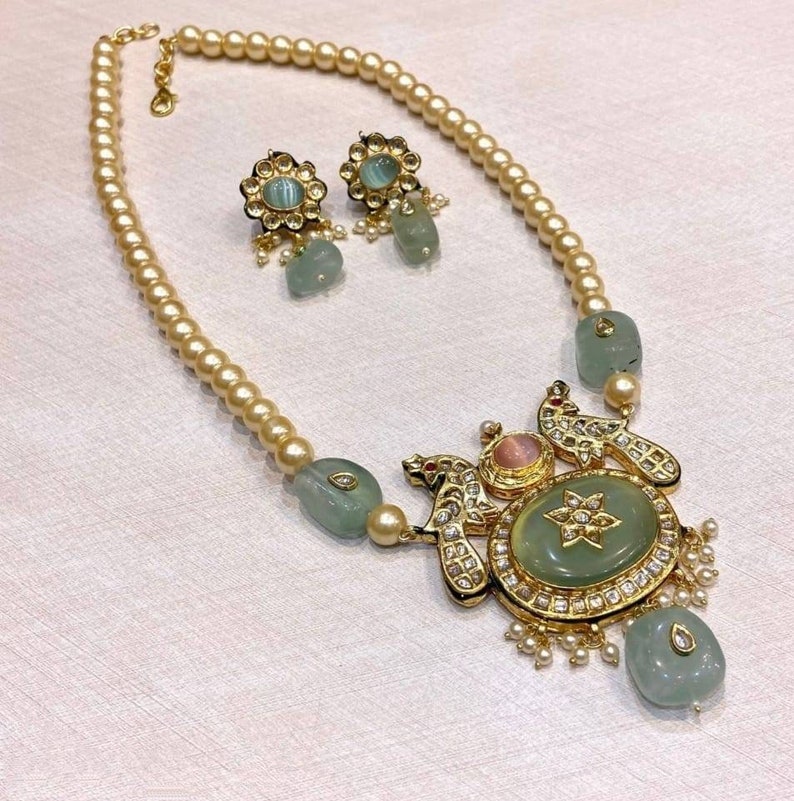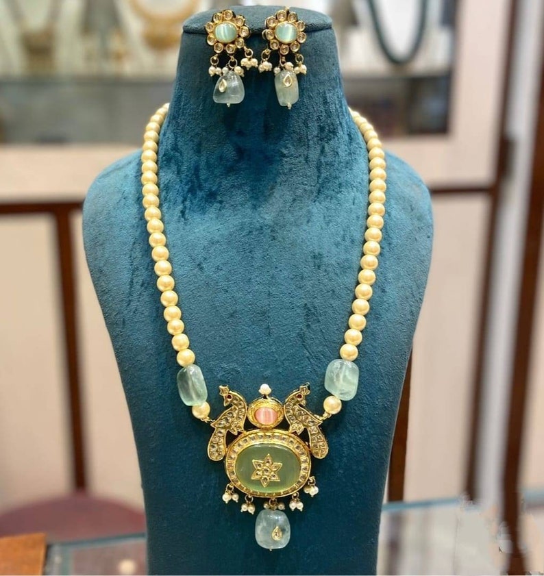 Pearl kundan long necklace Clearance, Mint Pink Pearl Kundan Long Necklace With Stud Earrings/indian - Etsy Clearance