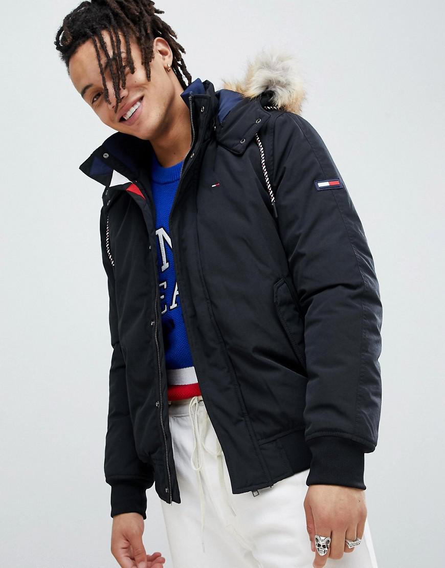 Tommy jeans technical quilted parka faux fur trim hood in black Clearance