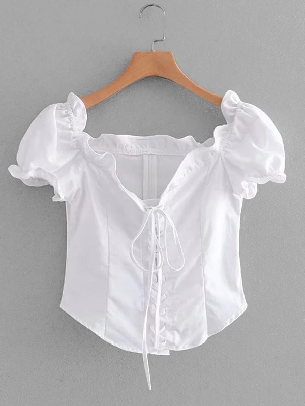 Blouse shein Clearance, Frill Trim Lace-Up Blouse | SHEIN USA Clearance