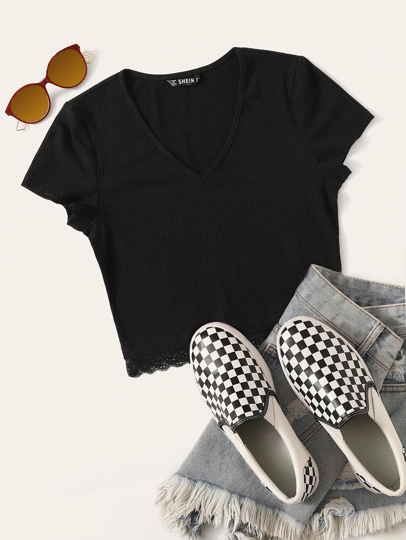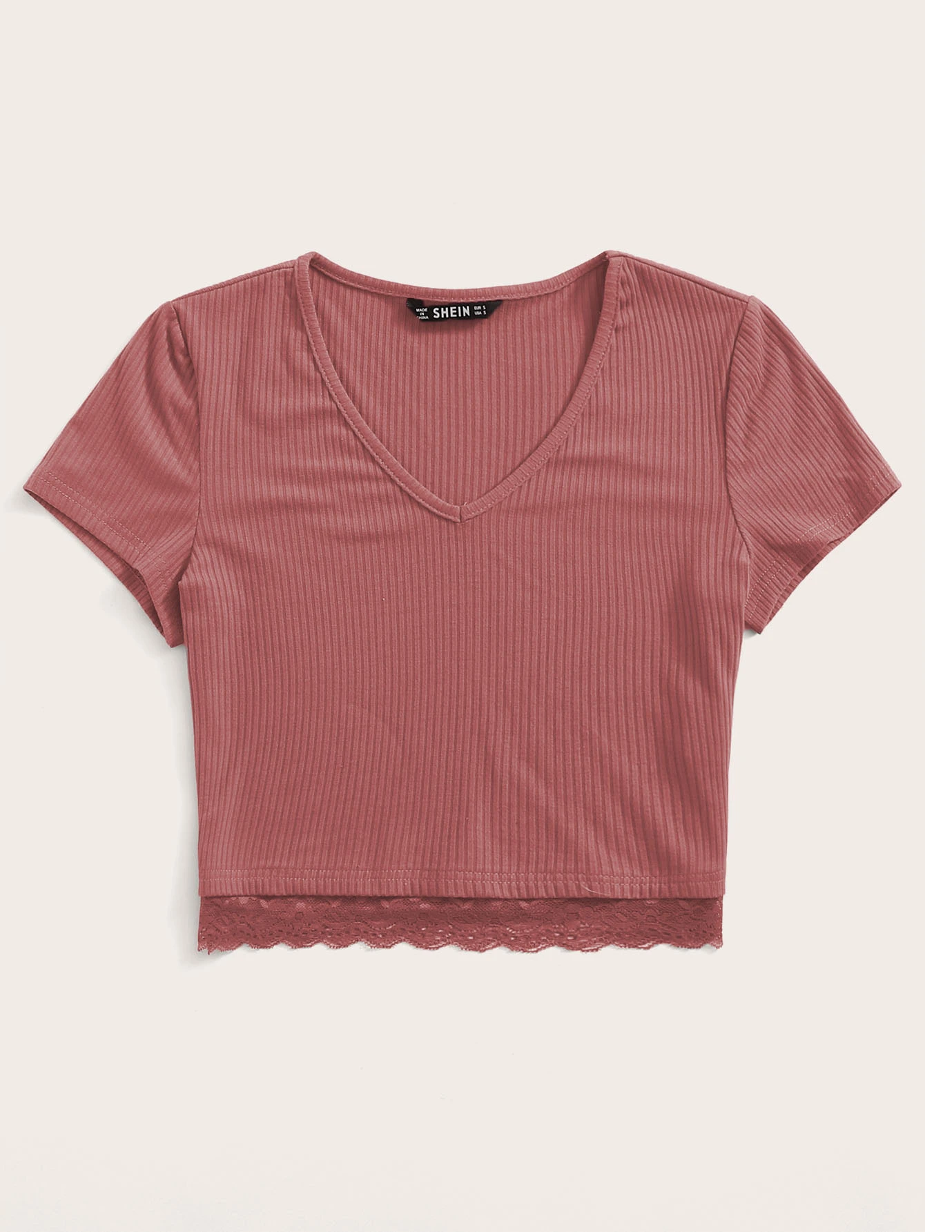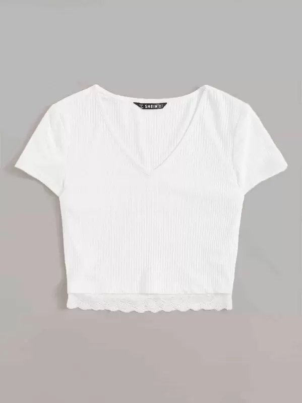 V neck lace hem rib knit top Clearance, V-neck Lace Hem Rib-knit Tee | SHEIN USA Clearance