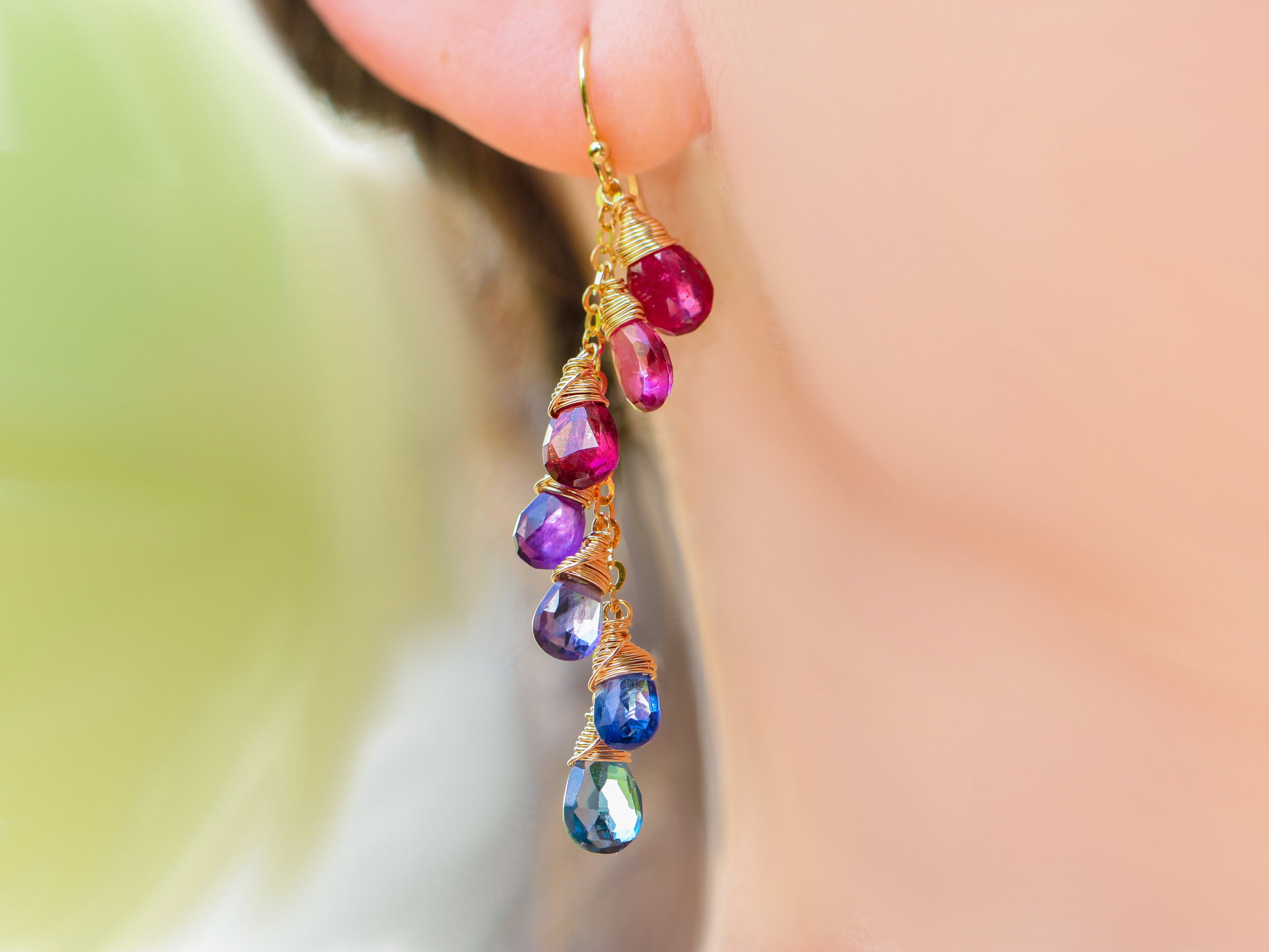 Colorful earrings Clearance, Multi Gemstone Colorful Rainbow Earrings Wire Wrapped in Gold Filled - Valltasy Clearance