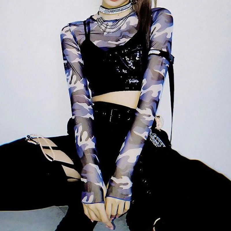 Blue camo mesh top Clearance, Blue Camo Mesh Longsleeve Crop Top Clearance