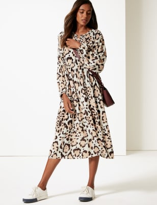 M and s animal print dress Clearance, Animal Print Long Sleeve Tea Midi Dress Clearance