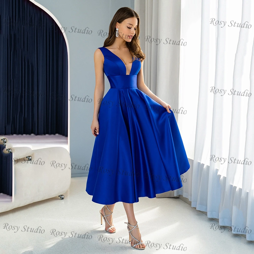 Kleid blau cocktail Clearance, Einfache Tiefem V-ausschnitt Royal Blue Cocktail Kleider A-line Satin Kurze Brautkleider Party Kleid Tee Länge Vestido de Festa Clearance
