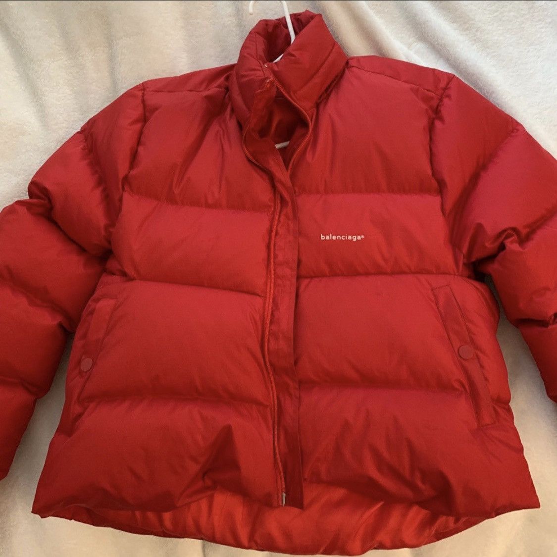 - Cheap Balenciaga oversized red puffer jacket