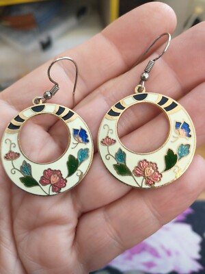 Off white dangle earrings Clearance, Vintage Off White Floral Chinese Cloisonne Dangle Earrings Open Circles Hook | eBay Clearance