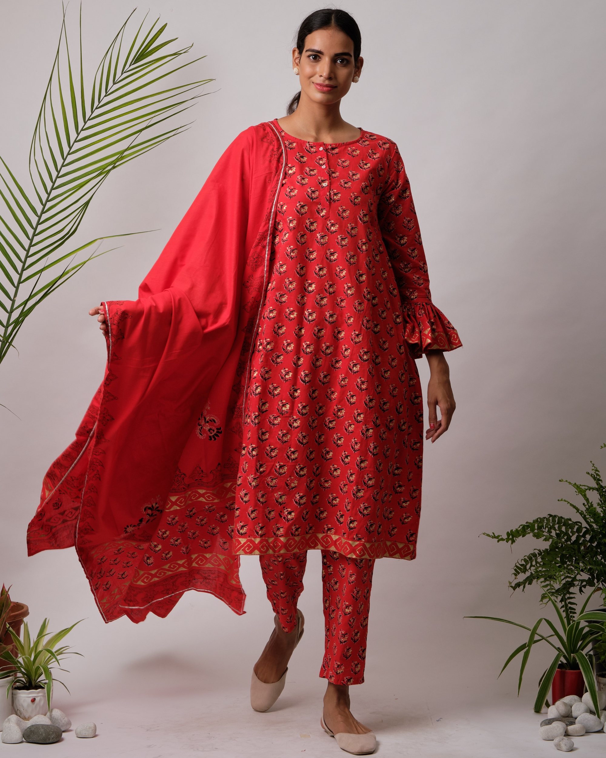 Red printed suit Clearance, black hand block printed suit set Clearance