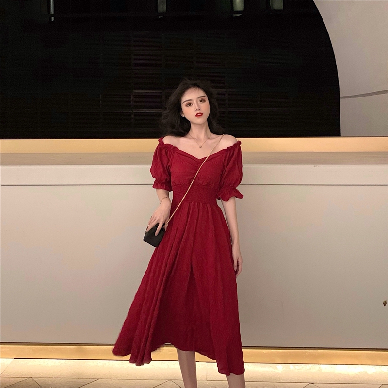- Red dress puff sleeves free shipping