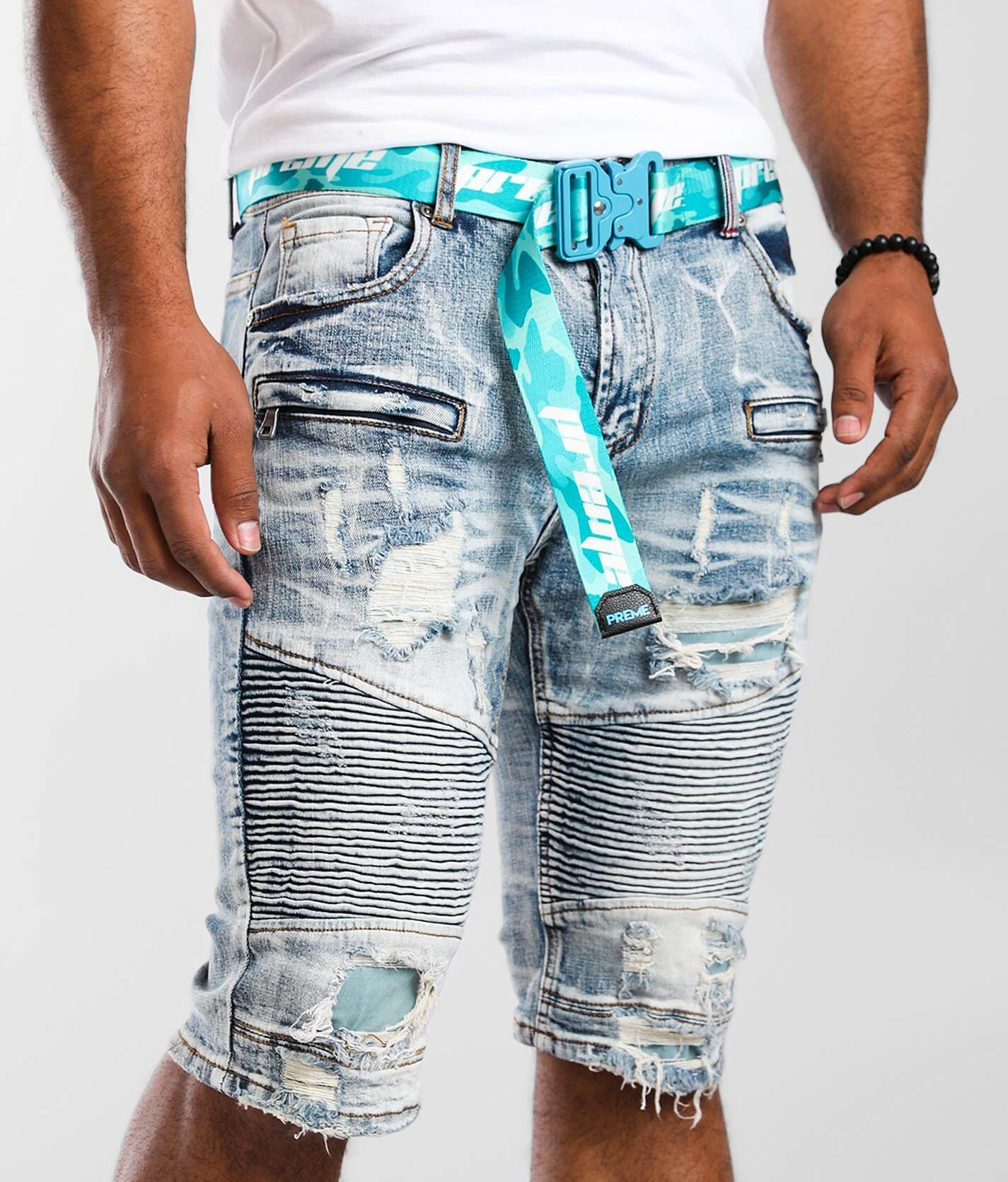 Preme denim shorts Clearance, Preme denim (sand/blue drip biker cut Clearance