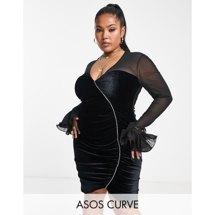 Asos lbd Clearance, ASOS LUXE Curve plunge neck velvet mini dress with sheer sleeves in black | ASOS Clearance