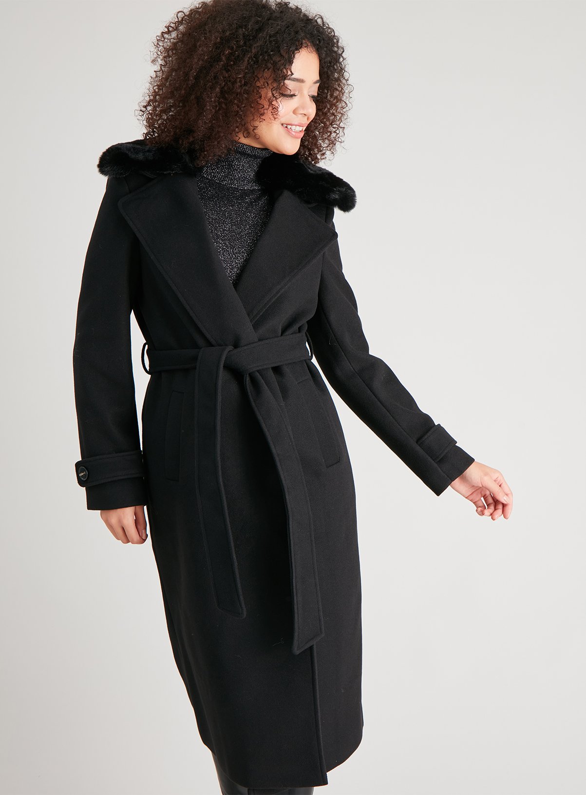 - Black belted coat with fur collar clearance