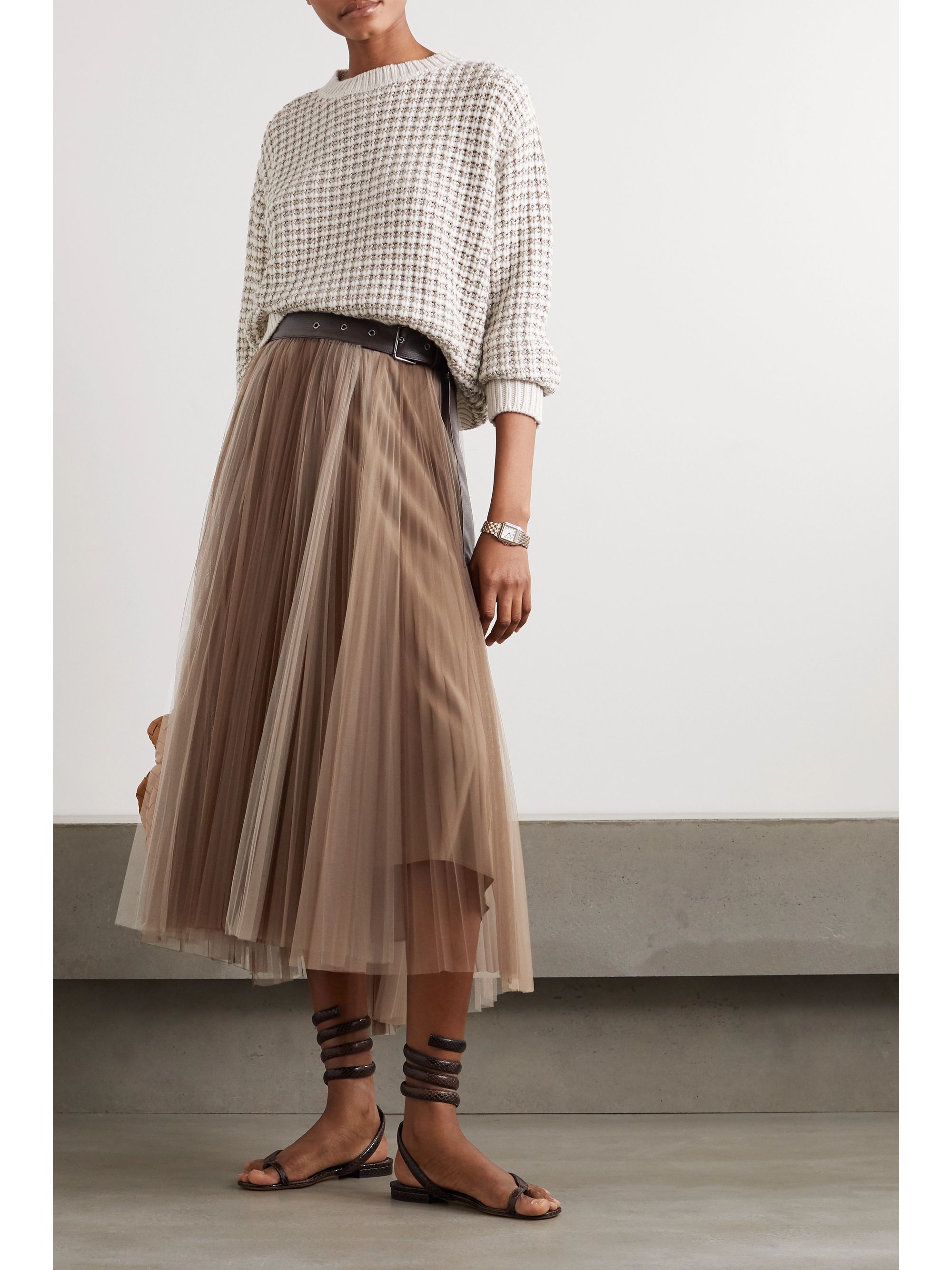 - Belted pleated midi skirt