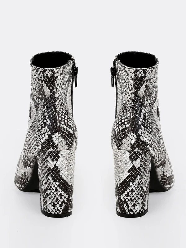 - Snakeskin chunky heel bootie