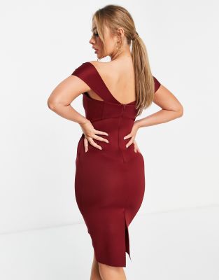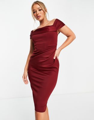Wine bardot dress Clearance, Wine Bardot Cowl Neck Ruched Midi Dress Clearance