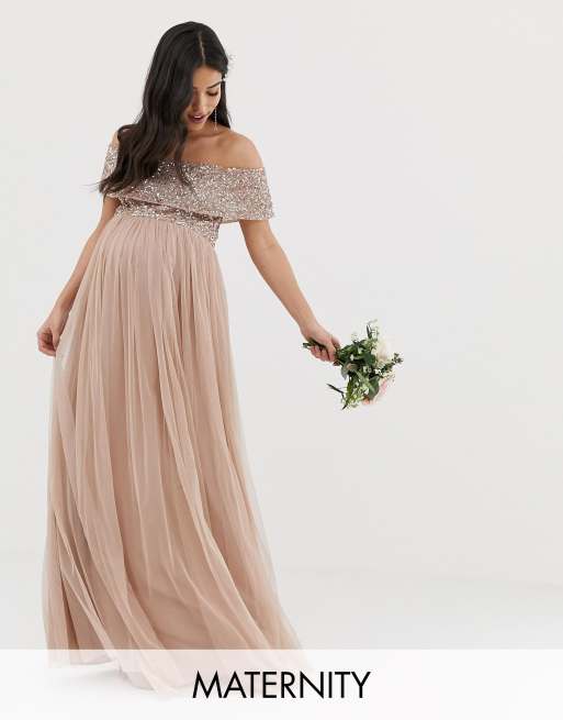 Sukienka asos maya maternity Clearance, Maya Maternity Bridesmaid – Szałwiowa tiulowa sukienka maxi z krótkimi rękawami i delikatnymi cekinami | ASOS Clearance