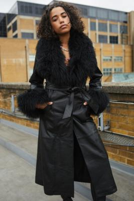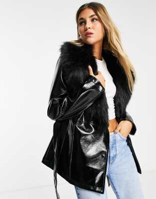 Black trim coat Clearance, Black Pu Faux Fur Trim Vintage Style Coat | PrettyLittleThing Clearance
