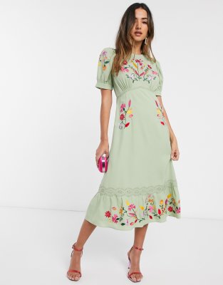 Sage green embroidered dress Clearance, ASOS DESIGN embroidered wrap maxi dress Clearance