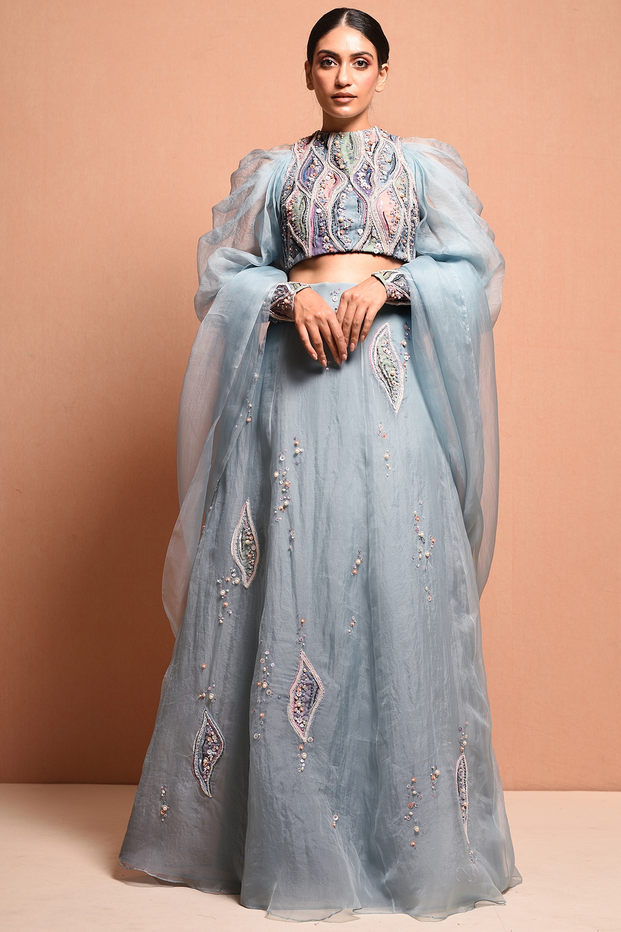 Cocktail lehengas Clearance, Midnight blue organza cocktail lehenga Clearance