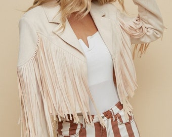 Cream tassel jacket Clearance, Cream suedette fringe studded jacket Clearance