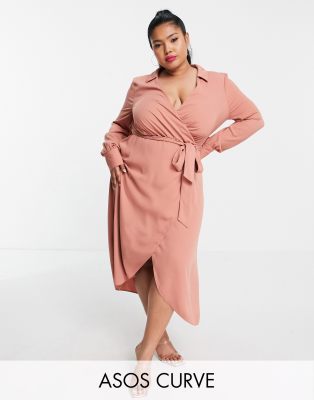 Wickelkleid midi curvy Clearance, ASOS DESIGN Curve – Midi-Wickelkleid in Terrakotta mit Kragen und Bindegürtel Clearance