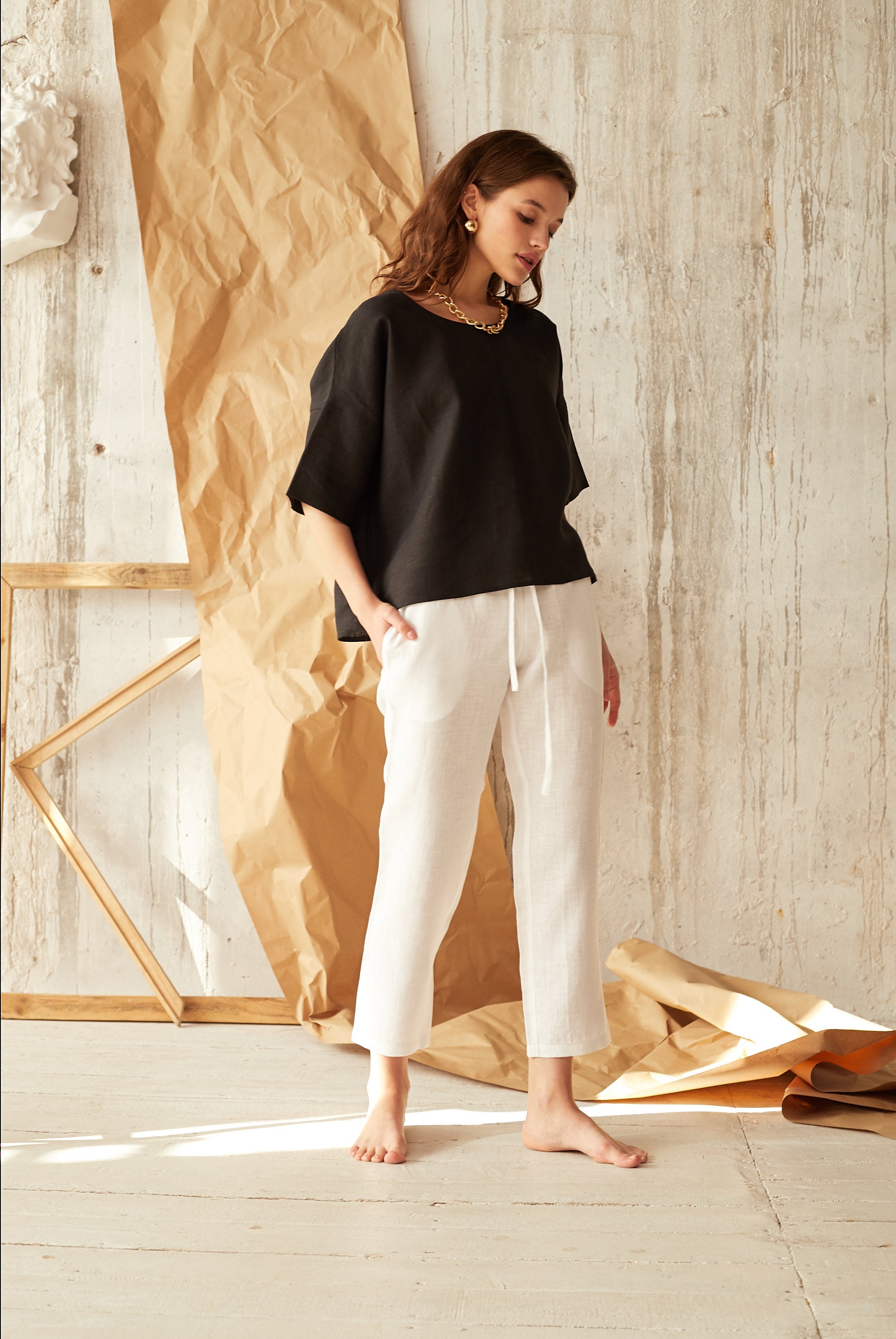 - Black linen top womens sale