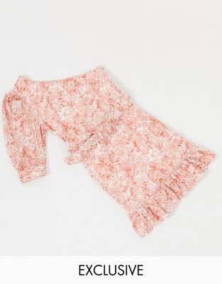 - Dark pink one shoulder belted mini dress with frill hem in peach nectar print clearance