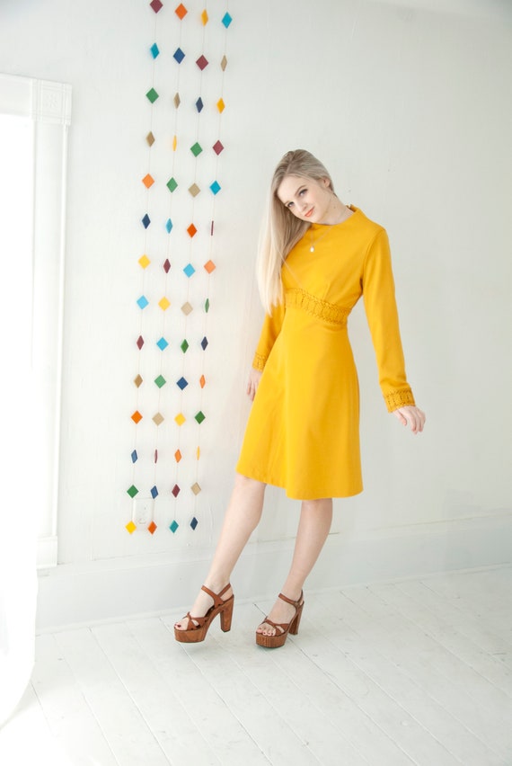 - Vintage dark yellow long sleeves and high collar dress with a black belt shop