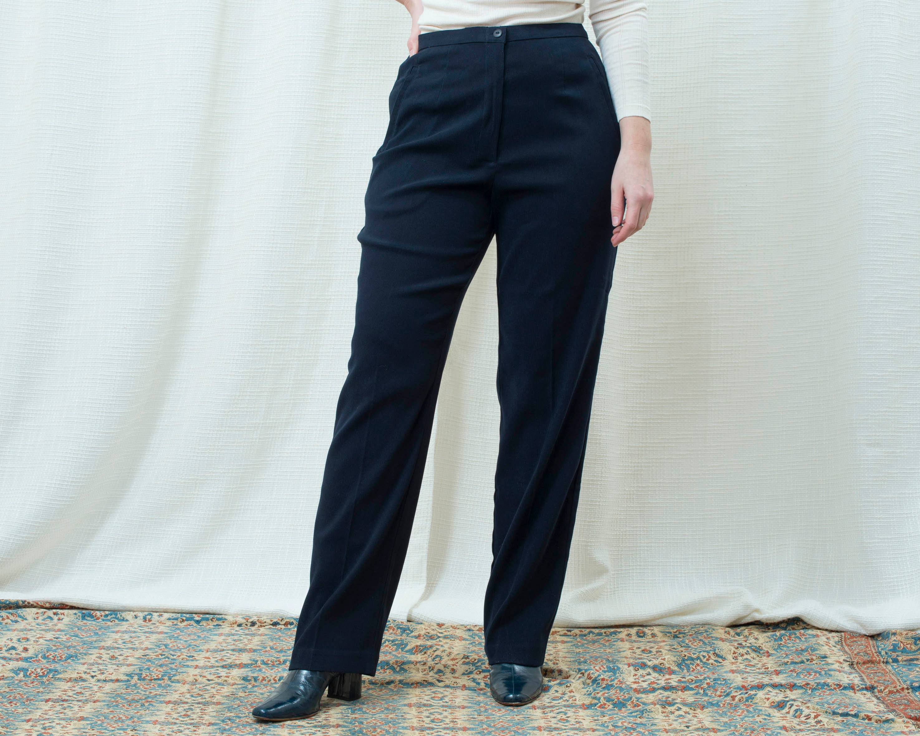 - Navy blue high waisted trousers