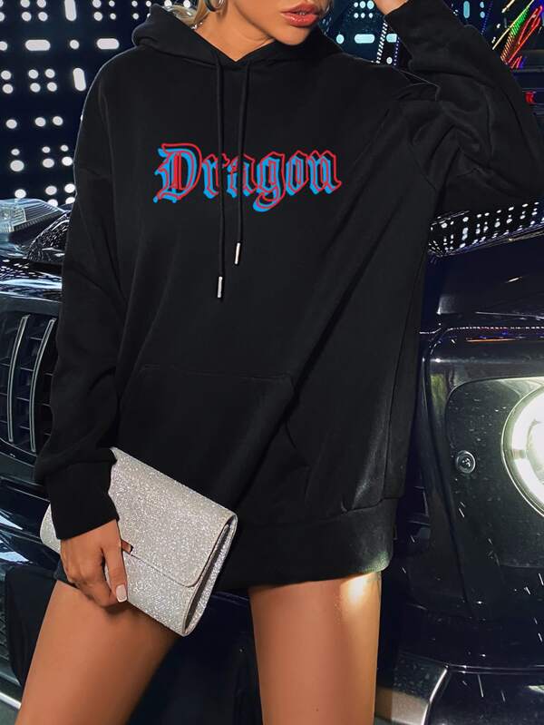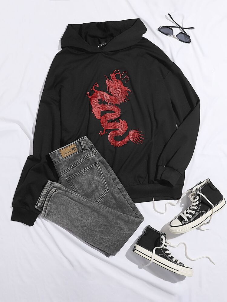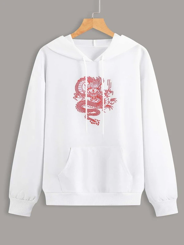 Dragon hoodie shein Clearance, Dragon Print Kangaroo Pocket Drawstring Clearance