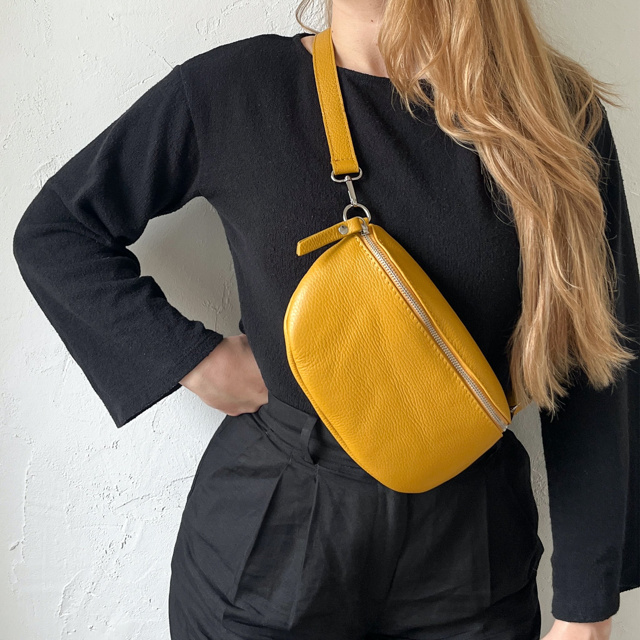 Gürteltasche senfgelb Clearance, lePelou Damen Leder Bauchtasche senfgelb mit wechselbarem Gurt Clearance