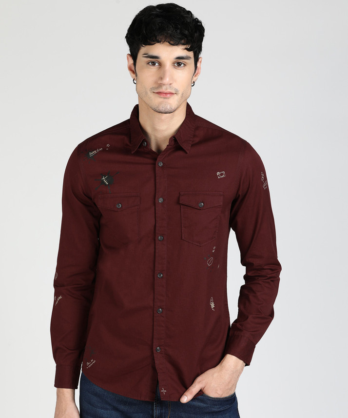 Spykar actif shirt Clearance, Spykar Men Printed Casual Maroon Shirt Clearance