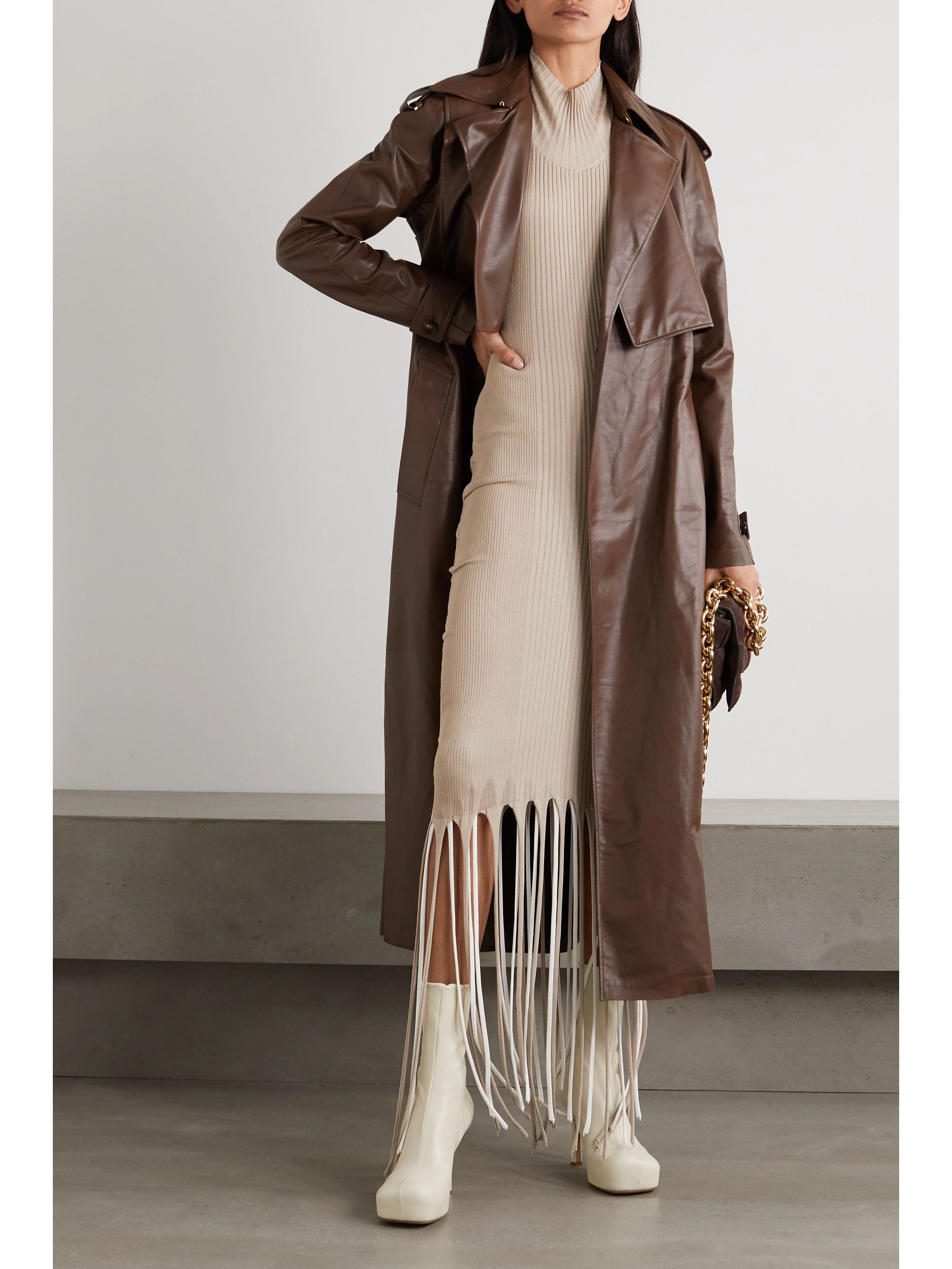 - Long brown leather trench coat
