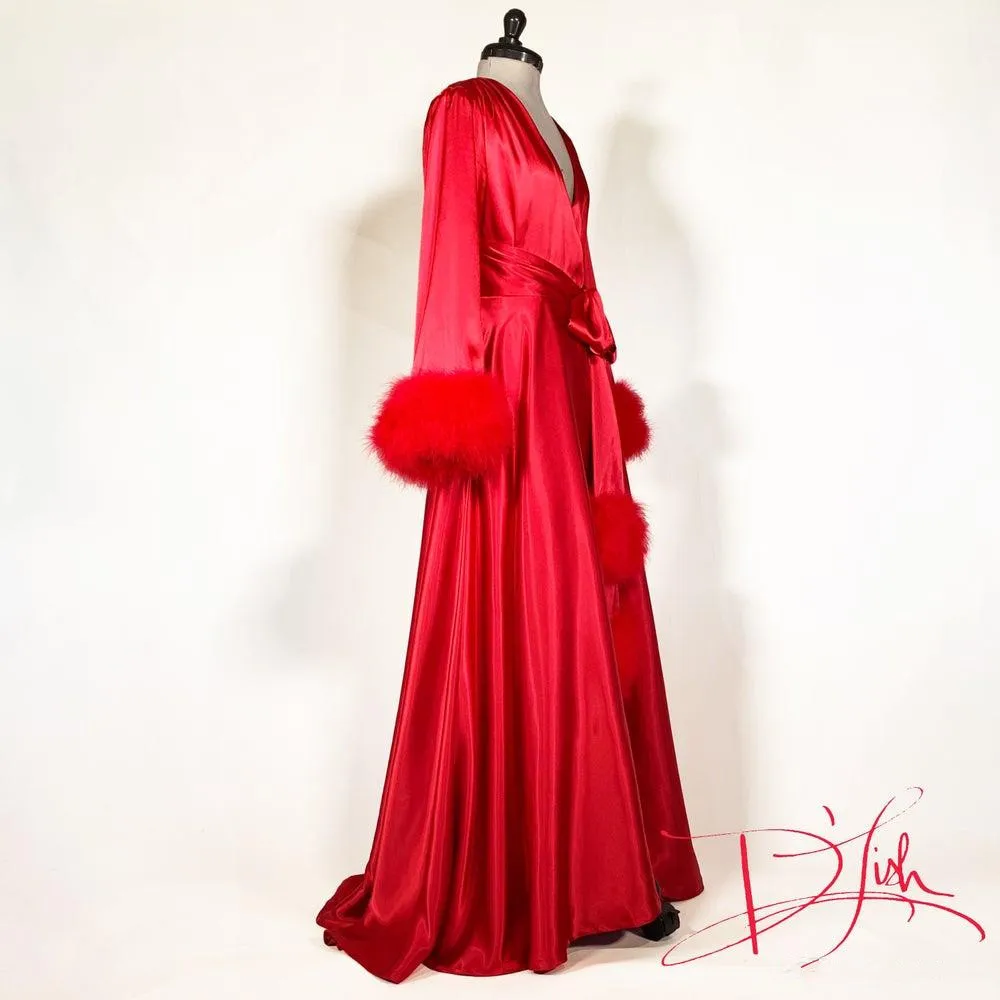 Red robe with fur Clearance, Satin robe with fox fur decor in red Clearance