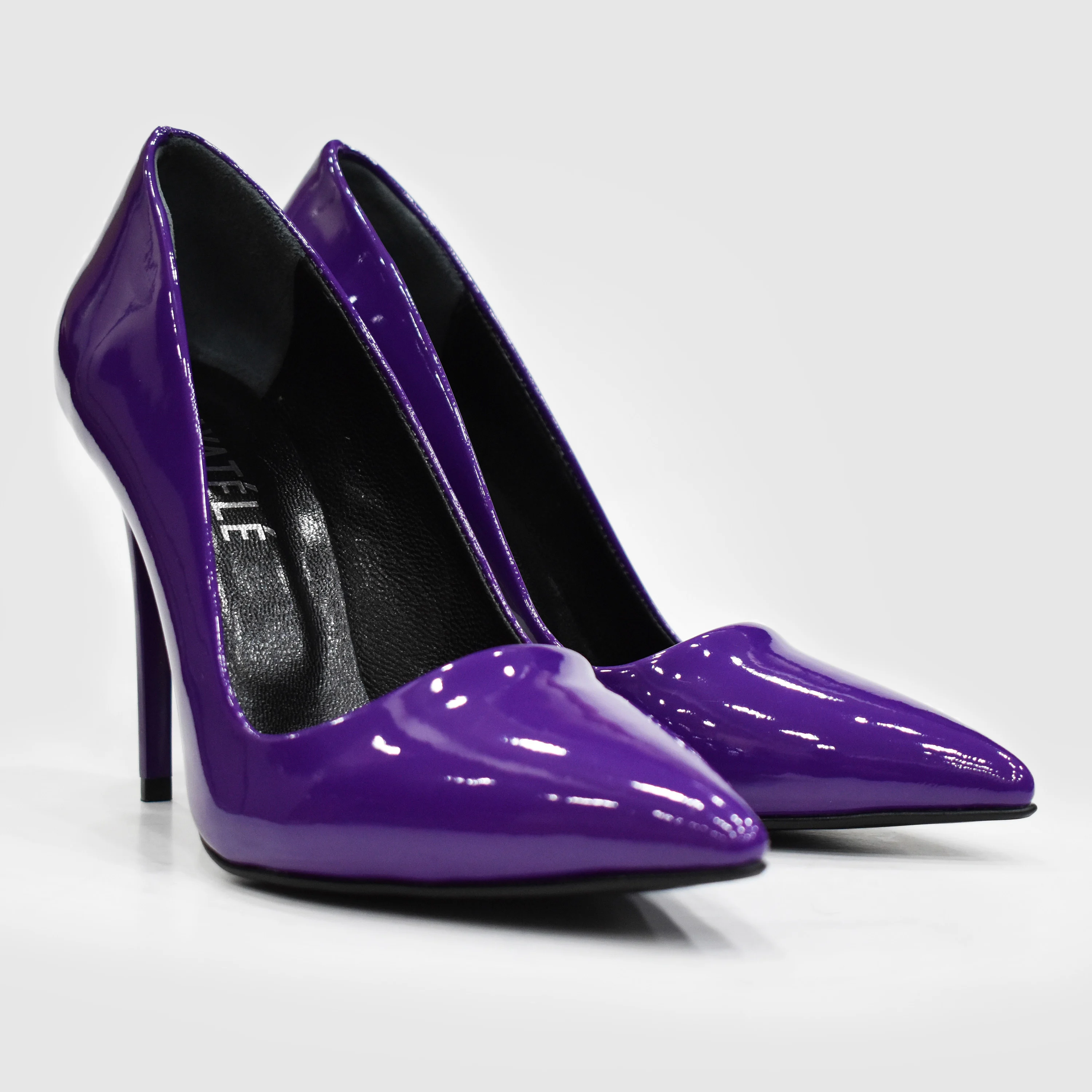 - Purple patent leather pumps