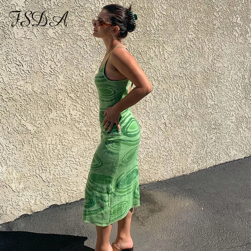 - Fsda 2021 print knit bodycon dress women green y2k summer hollow out sexy sleeveless spaghetti strap beach midi dresses party sale online