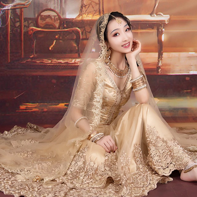 Bollywood kleider kaufen Clearance, Indische Traditionelle Kleidung Weibliche Bollywood Dance Goldene Saree Anzug Oriental Dance Bühne Leistung Kostüme Für Frauen DQL6466 Clearance