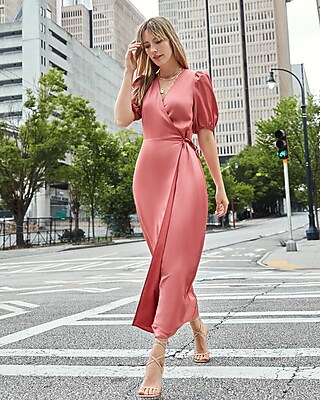 - Satin puff sleeve belted wrap maxi dress clearance