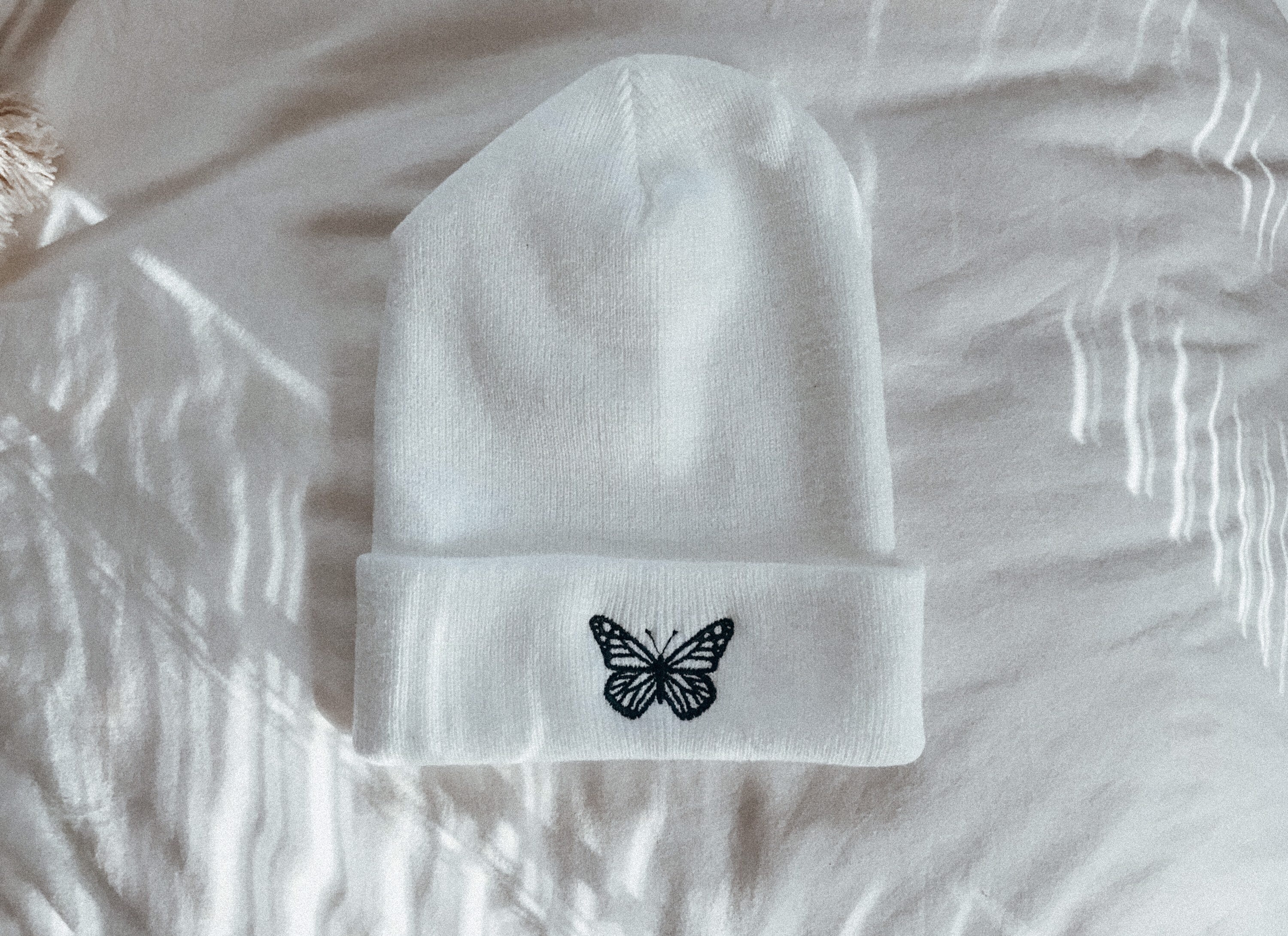 - White butterfly beanie