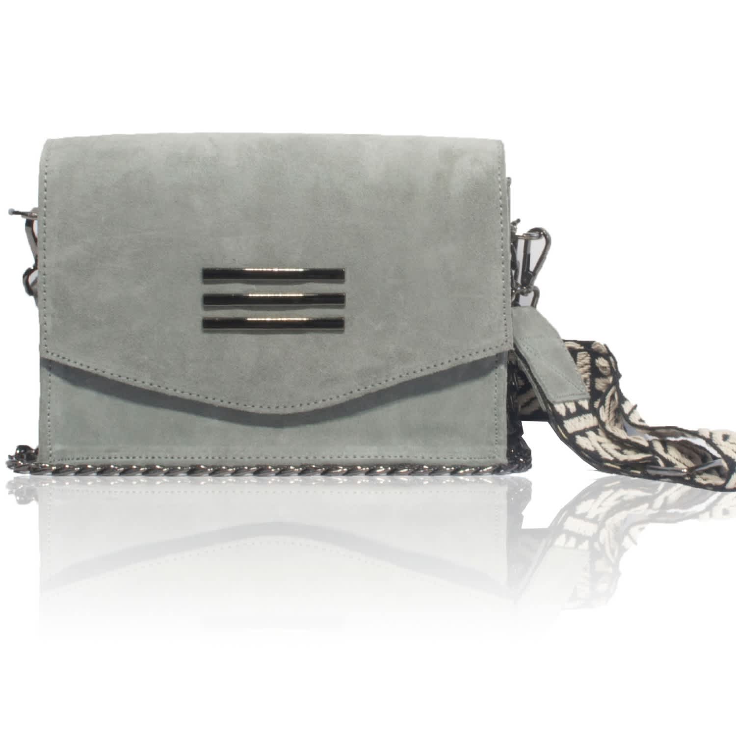 - Grey suede crossbody bag