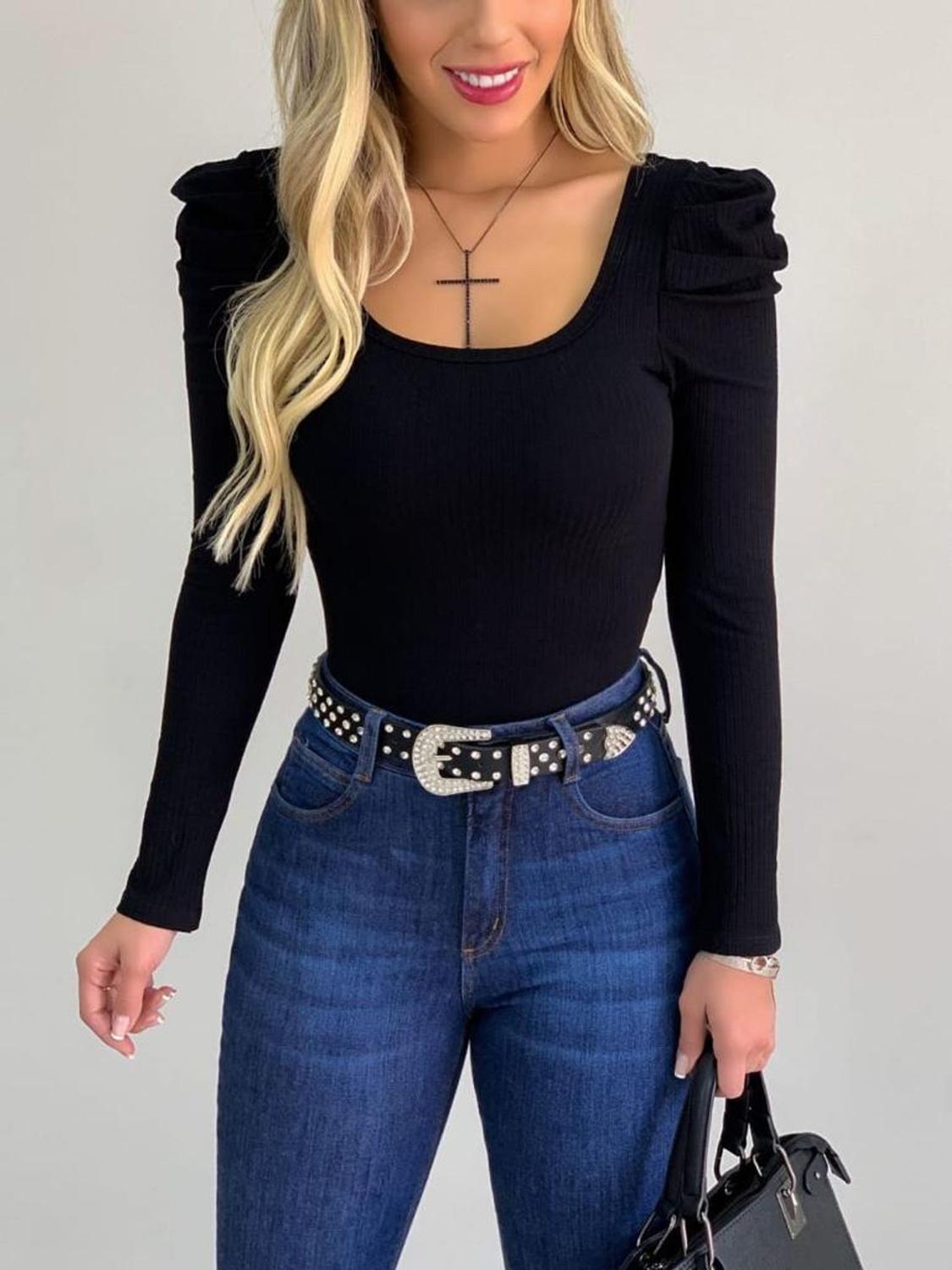 Body manga longa princesa Clearance, Body Canelado Manga Longa Princesa Preto Clearance